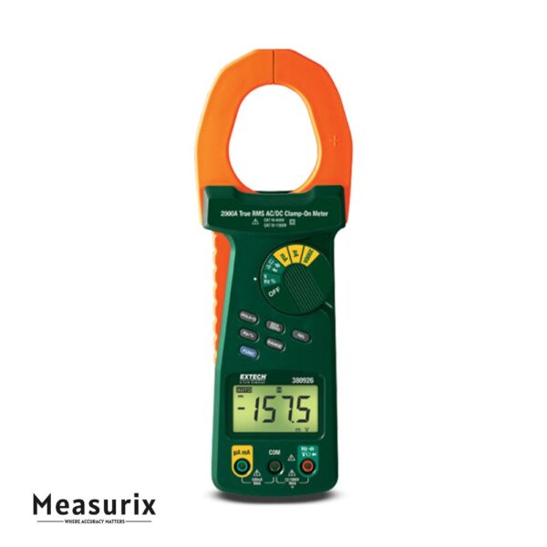 The Extech 380926 is a heavy-duty clamp meter engineered for high current measurements, offering true RMS accuracy for both AC and DC currents up to 2000 A. It also integrates full digital multimeter functionality and is designed for rugged field use in demanding electrical environments.