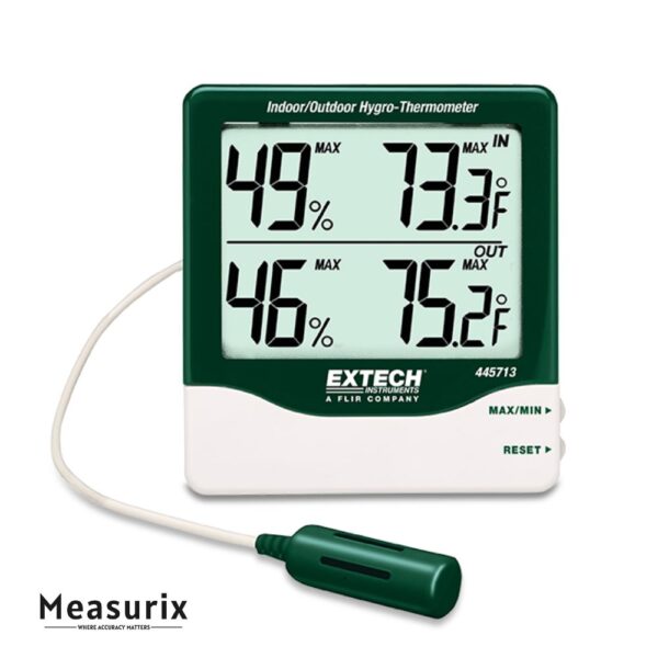 The Extech 445713 is a “big digit” indoor/outdoor hygrometer and thermometer that displays humidity and temperature readings for both inside and outside via a remote sensor. It supports MAX/MIN memory, comes with a remote outdoor sensor on a cable, and is built for wall-mount or desktop use in environments where simultaneous internal and external monitoring is needed.