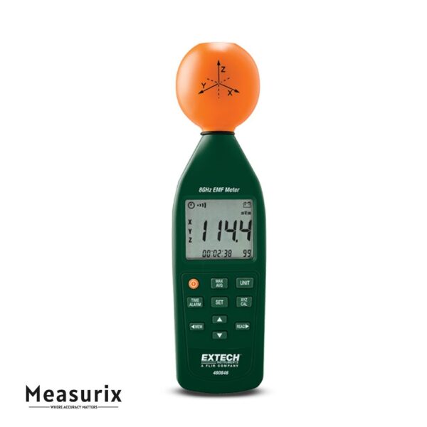 The Extech 480846 is a broadband RF field strength meter capable of measuring electromagnetic radiation from 10 MHz up to 8 GHz. With its isotropic 3-axis sensor, memory recall, alarm threshold, and multiple unit modes, it’s designed for RF “hot spot” detection, wireless system testing, and electromagnetic exposure monitoring.