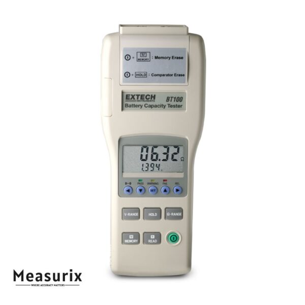 The Extech BT100 is a portable battery capacity tester that allows online testing of batteries without needing to disconnect them. It simultaneously measures DC voltage and AC resistance (milliohms), stores test results in internal memory, and supports PC-based data export — making it a practical tool for quick battery health assessment in the field.