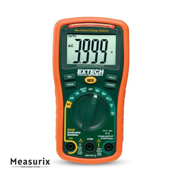 The Extech EX330 is a compact, autoranging 12-function multimeter that brings professional-level measurement capabilities into a portable form. Equipped with True RMS-like accuracy and a built-in non-contact AC voltage detector, it is designed for technicians needing diverse functionality in one device.