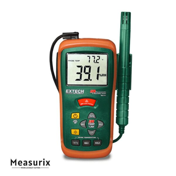 The Extech RH101 is a combination hygrometer and non-contact infrared thermometer. It measures relative humidity, ambient air temperature (via probe), and surface temperature (via IR) all in one handheld unit. With a dual backlit LCD display, selectable primary display (IR or humidity), laser targeting, and built-in functions like Data Hold and MAX, it’s a versatile tool for HVAC, building inspection, and environmental monitoring.