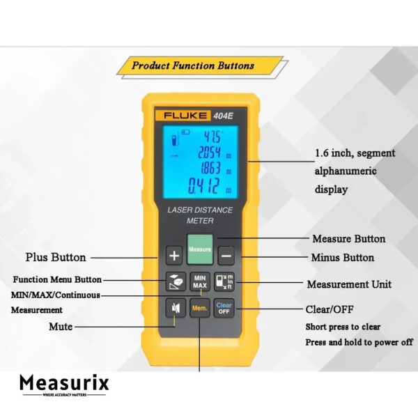 The Fluke 404E Laser Distance Meter is a compact, reliable, and user-friendly measuring tool designed for quick and precise distance measurements up to 40 meters. Built with durable construction, IP54 protection, and one-button operation, it is perfect for professionals and DIY users working in construction, electrical, interior design, and HVAC installations.