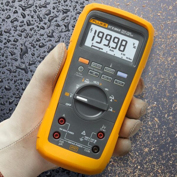 The Fluke 87V MAX True-RMS Digital Multimeter sets a new benchmark for rugged, high-performance multimeters designed to handle extreme conditions while delivering precise electrical measurements. Built for industrial environments, it features a durable case with a removable holster that doubles as a test probe holder, allowing convenient one-handed operation. Engineered to withstand drops up to 4 meters (13 feet) and rated IP67 for waterproof and dustproof protection, the 87V MAX is ideal for work in harsh environments, whether outdoors, in dusty factories, or near wet electrical panels.