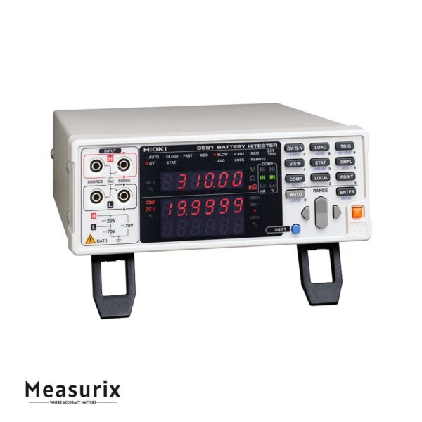 The Hioki 3561 is engineered for use in automated production environments to test small secondary batteries rapidly and accurately. It uses a four-terminal AC method to measure internal resistance (IR) while simultaneously measuring battery voltage (OCV). The unit offers two resistance measurement ranges (300 mΩ and 3 Ω) and a voltage measurement range up to 20 V, with fine resolution and precision. Its measurement cycle is very fast (approx. 3 ms response time) to keep up with high throughput. The 3561 supports external triggering, comparator judgments (Hi/Lo/In), and standard interfaces (RS-232C, external I/O). It includes memory capability for storing up to 400 measurement results, and features like averaging, zero adjustment, and statistical processing help maintain consistent quality control.
