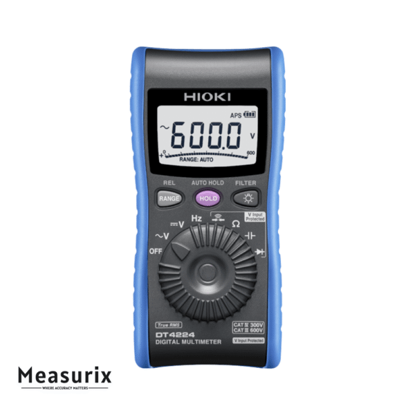The Hioki DT4224 is a compact True RMS digital multimeter designed for general-purpose electrical measurements. It offers a wide AC voltage range up to 600 V and features a 6000-count display for precise readings. With its high input impedance and safety features, it’s suitable for professionals requiring reliable performance in various environments.