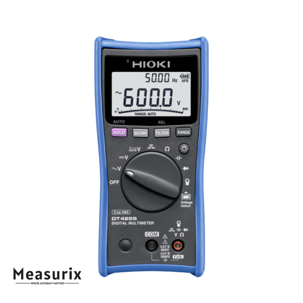 The Hioki DT4255 is a True RMS digital multimeter engineered for safety and precision in demanding environments. It offers a wide measurement range, including AC/DC voltage up to 1000 V, and supports current measurements via compatible clamp sensors. Designed with fuse-protected terminals and a low-pass filter, it ensures accurate readings even in the presence of harmonic distortion. Its robust construction and user-friendly features make it suitable for professionals requiring reliable performance in the field.