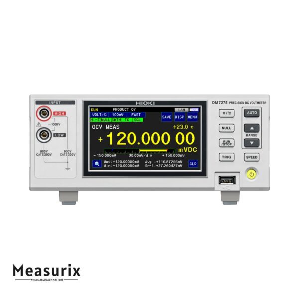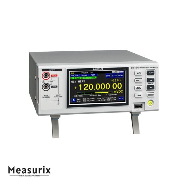 The Hioki DM7275 Precision DC Voltmeter is a high-accuracy benchtop instrument designed for precise DC voltage measurements in research and development, as well as production environments. It offers a 7½-digit resolution with a guaranteed 1-year accuracy of 20 ppm (0.002%) at the 10 V range. The voltmeter features a built-in capacitance contact check to ensure reliable probe contact, making it ideal for applications such as lithium-ion battery testing, electric vehicle component development, and other high-precision measurements.