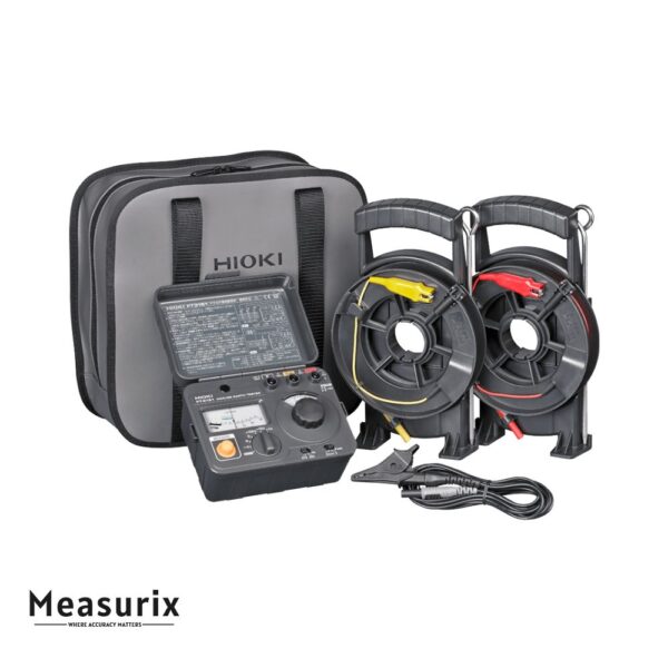 The FT3151 is designed to reliably measure grounding resistance in varied field environments. You can switch between the three-electrode (precise) and two-electrode (simple) methods depending on site requirements. It uses an AC potentiometer system, operating at either 575 Hz or 600 Hz, which helps mitigate distortion from power supply harmonics. The tester handles resistance measurements up to 1150 Ω via three ranges (10 Ω, 100 Ω, 1000 Ω). It also measures earth potential (voltage between the test electrode and earth) up to 30 V. The unit is powered by six AA batteries and is built with ergonomic lead winders to simplify cable handling. Overvoltage protection, auxiliary electrode checks, and a clear analog dial help maintain reliable readings under real‐world conditions.