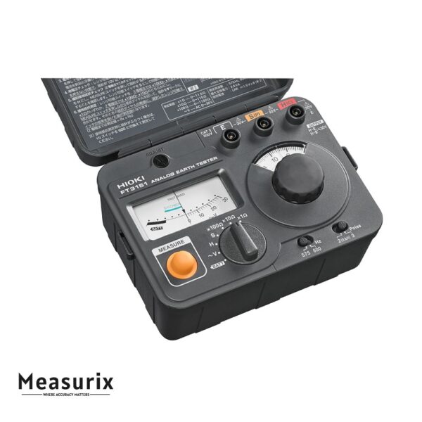 The FT3151 is an analog earth (ground) resistance tester that supports both two-pole and three-pole measurement methods. It covers a wide resistance range (0 to 1150 Ω), offers selectable measurement frequencies to reduce interference, and includes built-in lead winders for easier setup and pack-up.