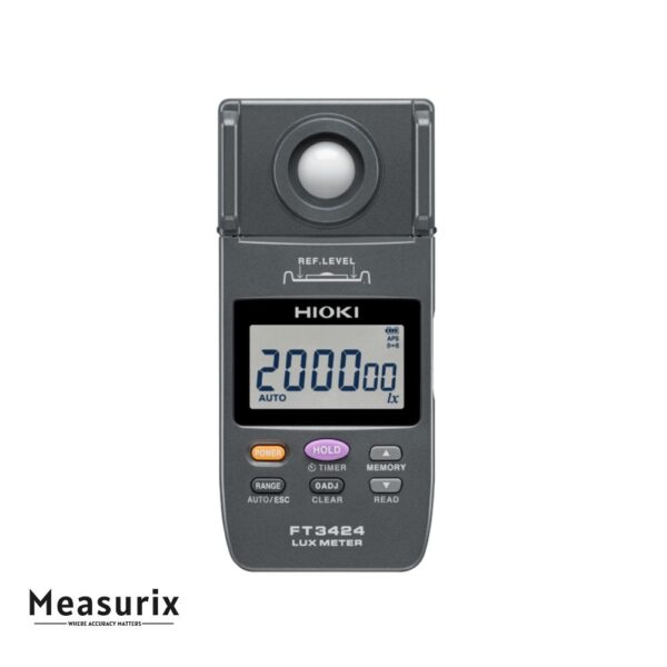 The Hioki FT3424 Lux Meter is engineered to provide accurate and reliable illuminance measurements across a wide range of lighting conditions. With its five selectable measurement ranges—20 lx, 200 lx, 2,000 lx, 20,000 lx, and 200,000 lx—it caters to both low and high illuminance scenarios. The device utilizes a silicon photodiode as the light-receiving element and features a large, easy-to-read LCD display with a backlight that activates automatically in low-illuminance environments.