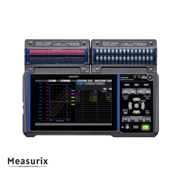 The Hioki LR8450 is a high-speed, multi-channel data logger designed for precise and synchronized measurements in industrial and research applications. With a sampling rate of up to 1 millisecond, it supports up to 120 channels using wired plug-in modules. The LR8450-01 model enhances this capability by adding wireless LAN functionality, allowing for up to 330 channels, making it ideal for complex systems like automotive testing, robotics, and structural monitoring.