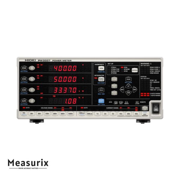 The PW3337 is a 3-channel AC/DC power meter suited for measuring single-phase and three-phase (up to 4-wire) electrical equipment. It handles DC through high frequency ranges, supports voltages up to about 1000 V, direct currents up to about 65 A, and allows for high current measurement via external sensors. Its high precision makes it useful in development, production, and evaluation of inverters, motors, power supplies, etc.