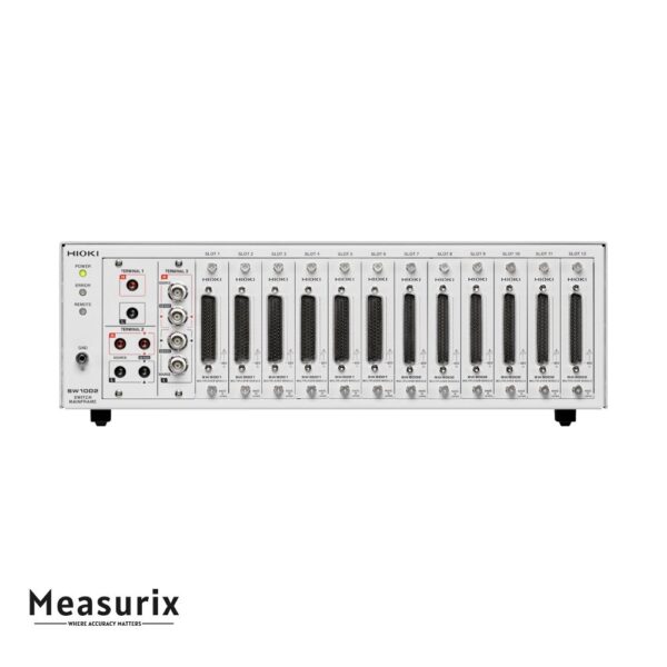 The SW1002 is a switch mainframe designed for multi-channel battery testing. It houses multiplexer modules, allows connection of two measuring instruments, supports tests like OCV, internal resistance, and external potential, and handles signal levels up to 60 V DC.