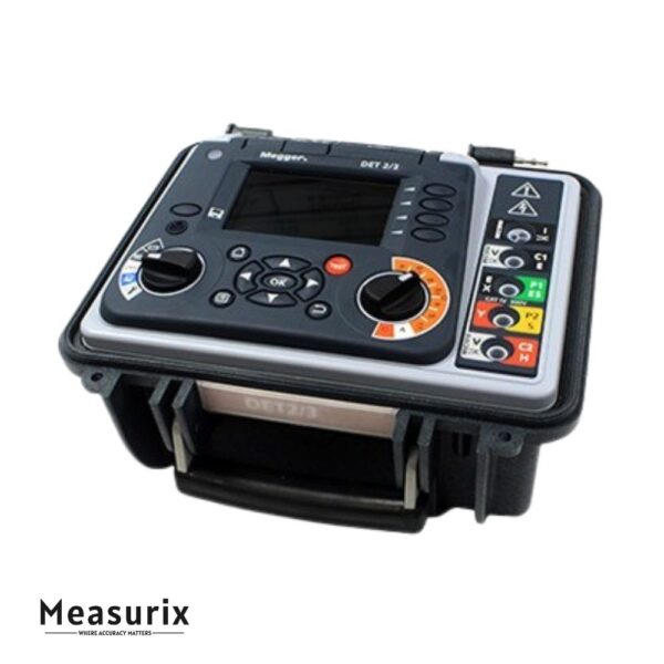 The Megger DET2/3 is a high‑resolution earth (ground) resistance tester designed for large or complex grounding systems, offering 1 mΩ resolution, multiple test modes (2‑/3‑/4‑pole, soil resistivity, stakeless) and rugged field‑ready construction.