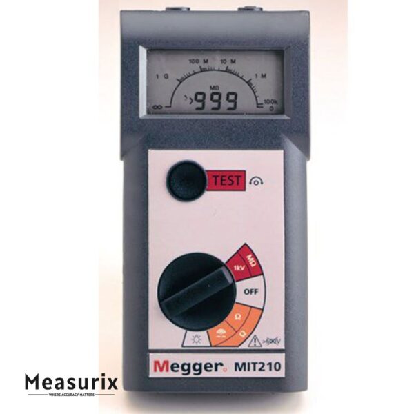 The Megger MIT210 is a compact and robust insulation and continuity tester designed for professionals requiring portability without compromising on performance. It offers insulation resistance testing up to 1000 MΩ, continuity testing at 200 mA down to 0.01 Ω, and features both digital and analog displays. With a CAT III 600 V safety rating and a wide operating temperature range, it’s suitable for various electrical testing applications.